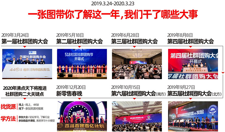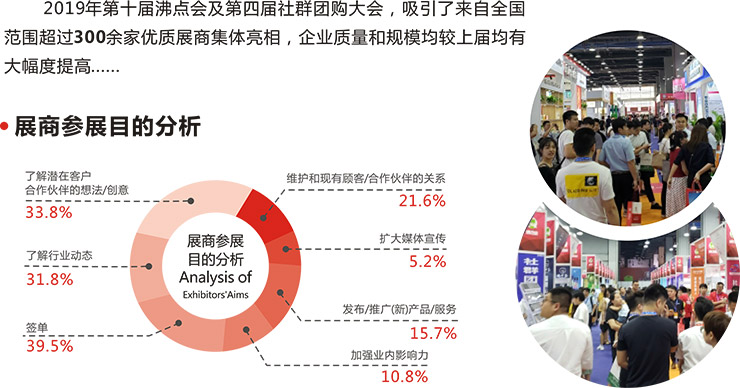會+展總覽 隨著《中華人民共和國電子商務(wù)法》的出臺和實施,中國新零售市場正處于蓬勃發(fā)展階段,預(yù)計今后的數(shù)年仍將保持上揚趨勢;社群團購、微商、社交電商成為中國新零售渠道占領(lǐng)市場的重要因素之一。在這一大趨勢下,第四屆社群團購大會與第十屆沸點會首度以【會+展】模式在2019年達到了空前規(guī)模,于2019年8月8日-9日在廣州國際采購中心召開,深度鏈接沸點天下五年來沉淀的全方位資源。從平臺品牌系統(tǒng)、供應(yīng)鏈系統(tǒng)、運營系統(tǒng)衍生社群團購基本邏輯,串聯(lián)成一完整的社群團購產(chǎn)業(yè)鏈年度盛會。