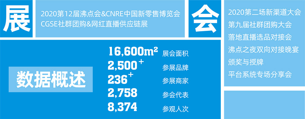 2020年8月8日-9日,第12屆沸點(diǎn)會(huì)CNRE新零售博覽會(huì),雖說是沸點(diǎn)會(huì)首次以展覽的形式登陸杭州,雖說是遭受新冠疫情的沖擊,但仍然吸引了來自全國范圍超過200余家優(yōu)質(zhì)展商、超過2000款品牌產(chǎn)品集體展出亮相,可見新渠道、新零售的市場(chǎng)熱度非同一般。