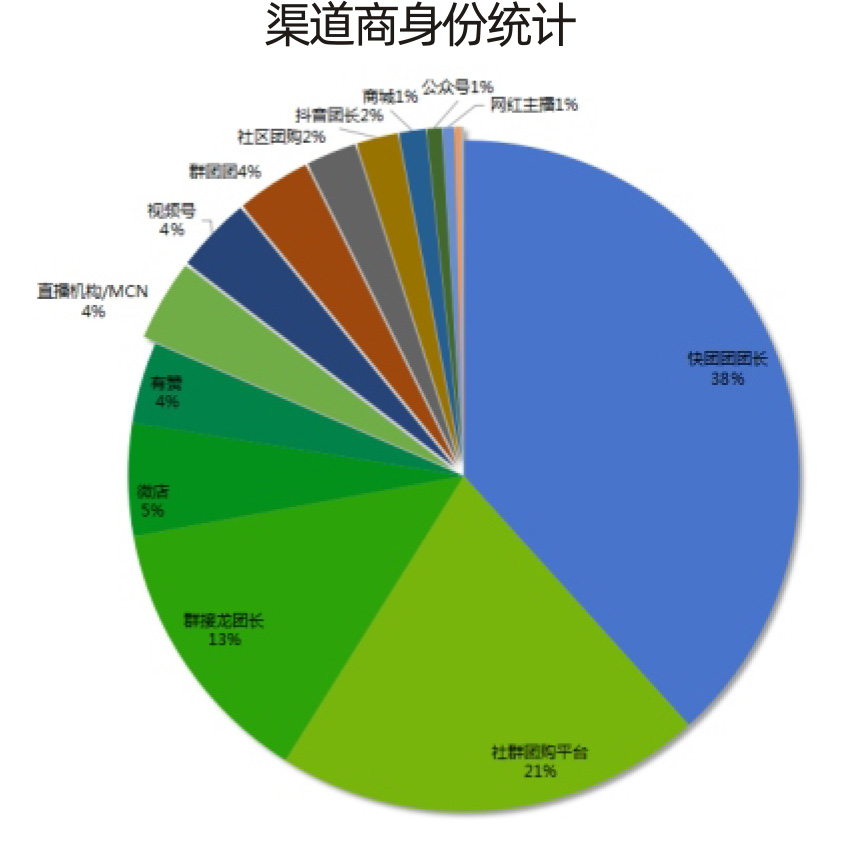 快團(tuán)團(tuán)團(tuán)長(zhǎng)38.3%;社群團(tuán)購(gòu)平臺(tái)20.61%;群接龍團(tuán)長(zhǎng)13.20%;微店13.20%;有贊(群團(tuán)團(tuán)團(tuán)長(zhǎng)未包含在內(nèi))3.92%