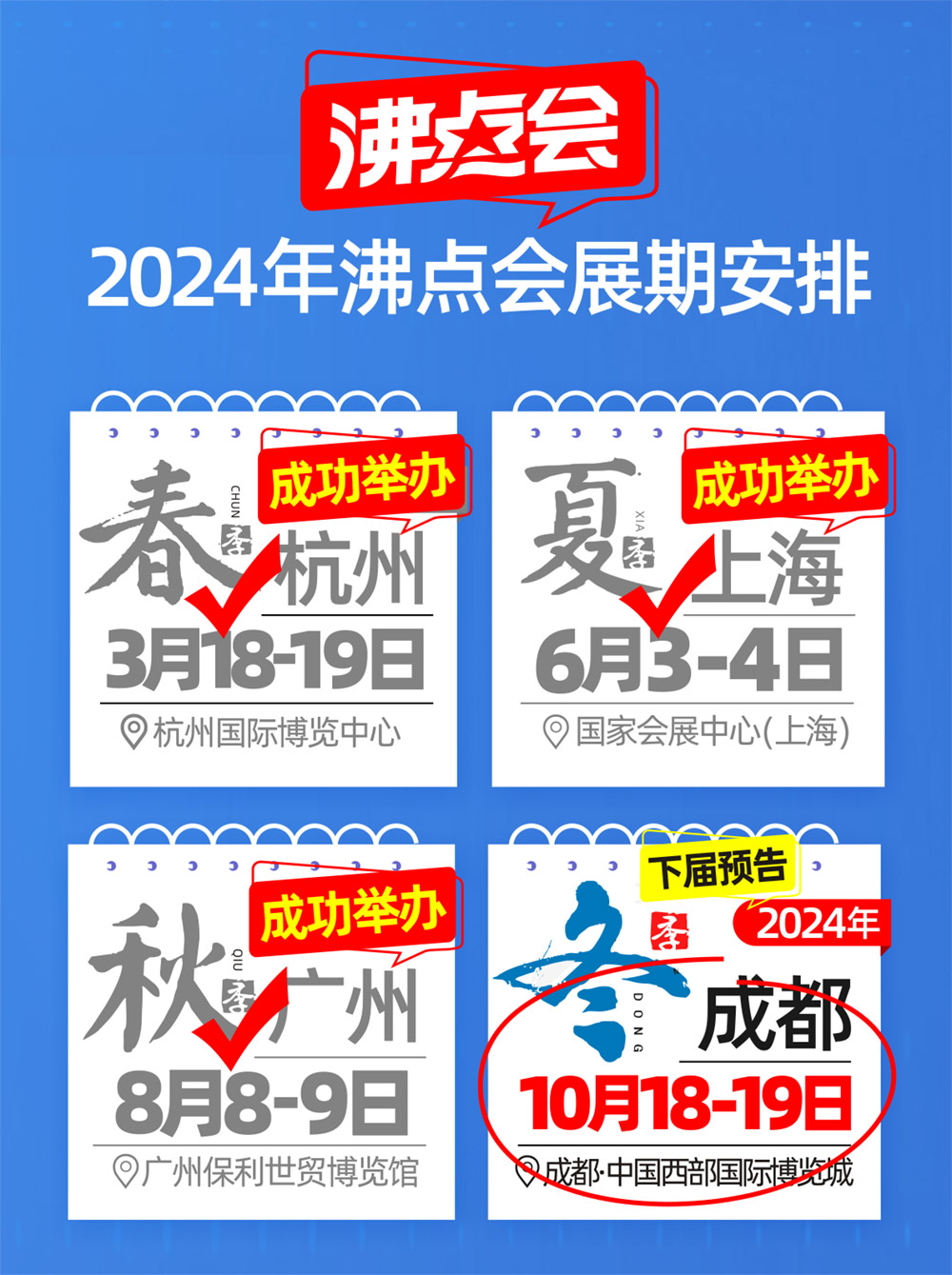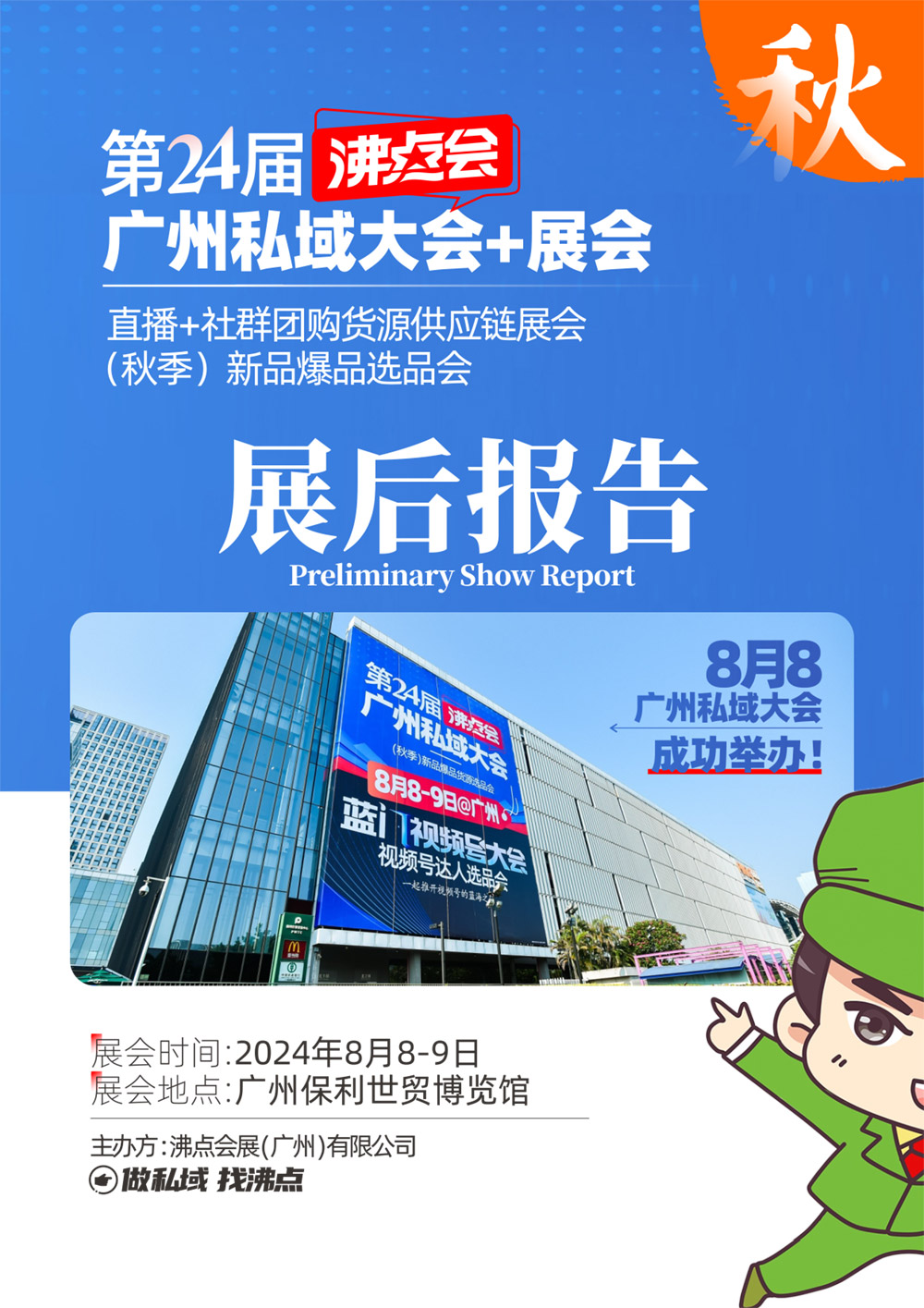 第24屆沸點會、廣州私域團長大會暨2024(廣州)直播+社群團購貨源供應鏈展覽會,于2024年8月8-9日,在廣州保利世貿(mào)博覽館圓滿舉辦!同期舉辦了2024(廣州)新品爆品貨源展覽會、2024全國地標美食博覽會以及有機食品店主選品會,本屆展 覽面積也是年度之最,六大展館全開,為私域渠道資源對接提供精準服務。
