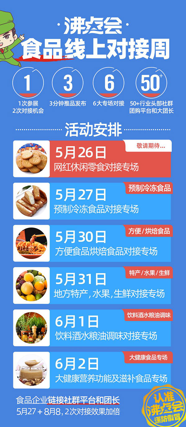 沸點會展特別打造的【沸點會.食品對接專場】,將于2022年5月26日-6月1日舉辦。此次活動是為食品產(chǎn)品企業(yè)提供一個與社群團購平臺及團長專場的對接機會,讓雙方快速精準對接,實現(xiàn)銷售增長。