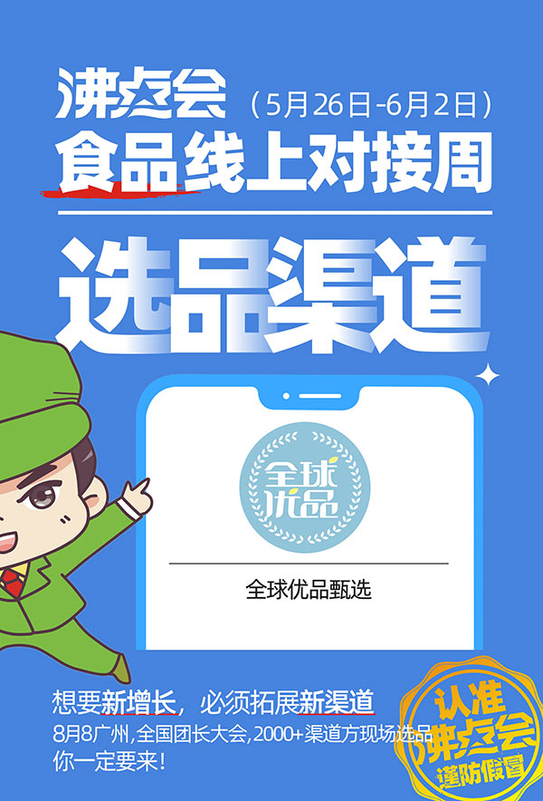 2022年5月26日-6月1日,為助力食品企業(yè)精準(zhǔn)對(duì)接社群渠道資源,把握社群食品品類的銷售增長(zhǎng)機(jī)遇,沸點(diǎn)會(huì)展特打造【沸點(diǎn)會(huì).食品對(duì)接專場(chǎng)】,目前,全球優(yōu)品甄選確認(rèn)出席沸點(diǎn)會(huì)·食品線上對(duì)接周。