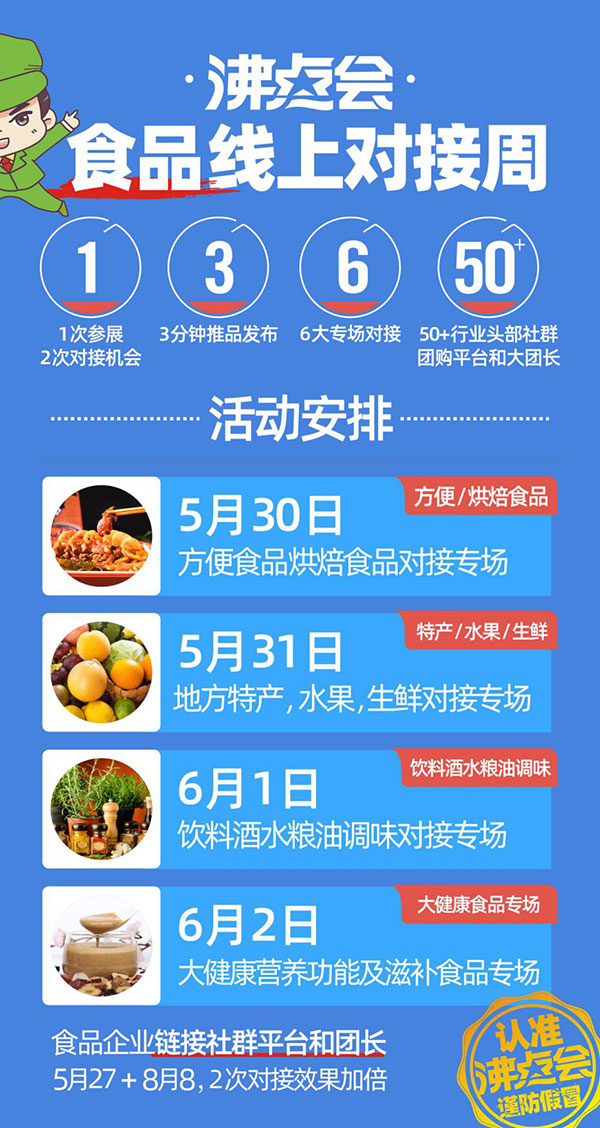 沸點會食品線上周還有進行中,接下來還有4場對接,如果你們家也是食品類的企業,如果你們也想對接大平臺大團長,歡迎聯系沸點天下工作人員報名。