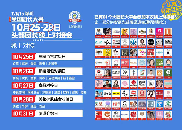 至于對接的日程,10月25日,居家百貨對接日;10月26日,服裝箱包對接日;10月27日,食品對接日;10月28日美妝護膚綜合對接日;