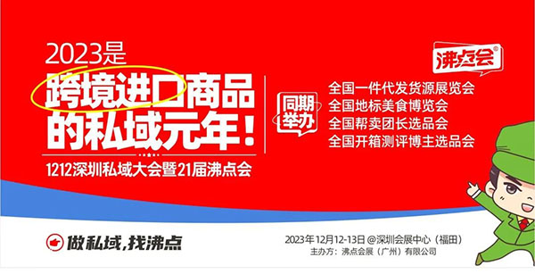12月12-13日,深圳,沸點(diǎn)會展全國私域大會上增設(shè)“跨境進(jìn)口商品”展覽主題,組織更多的跨境進(jìn)口商品企業(yè)參展及專業(yè)渠道進(jìn)行對接。