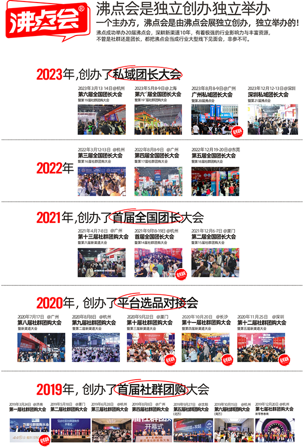 沸點(diǎn)會(huì)展是社群團(tuán)購(gòu)大會(huì),全國(guó)團(tuán)長(zhǎng)大會(huì),私域團(tuán)長(zhǎng)大會(huì)創(chuàng)辦者,也是社群生態(tài)鏈建設(shè)機(jī)構(gòu)。已經(jīng)成功舉辦了21屆沸點(diǎn)會(huì)。