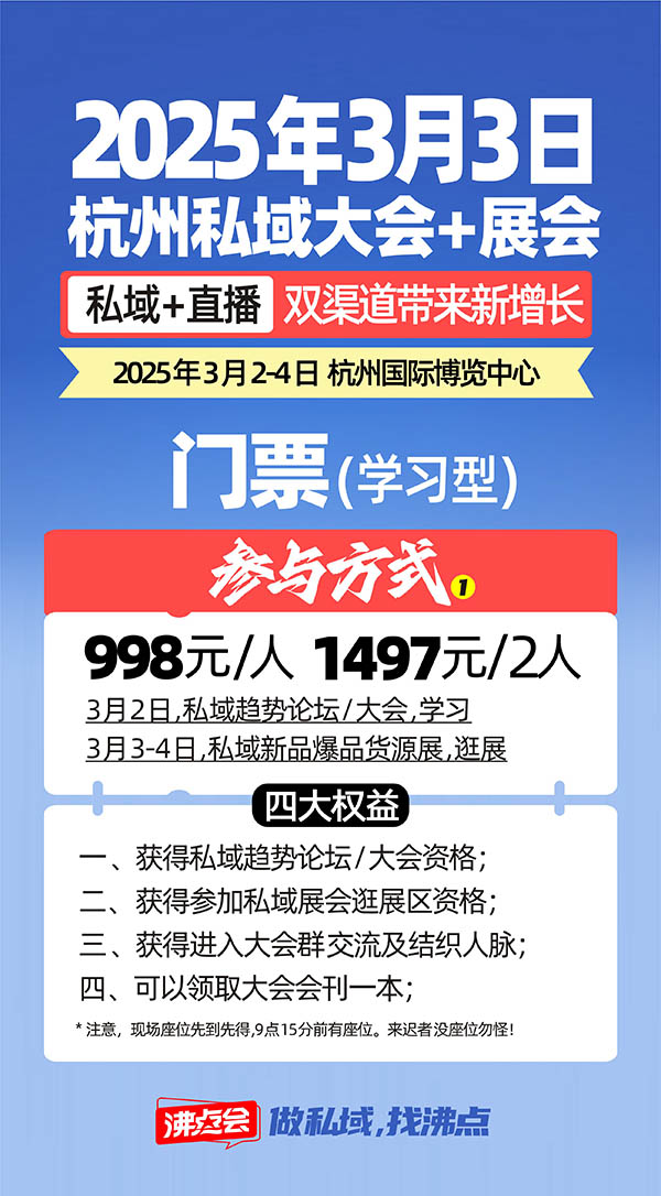 1、想了解私域行業的發展,想學習怎么做私域,可以購票參加私域大會也就是私域趨勢論壇!