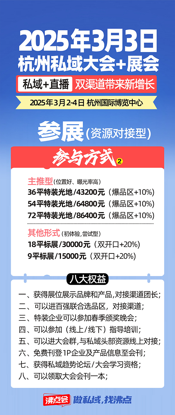 由沸點會發起舉辦的2025私域大會+私域展會,2025年檔期定于3月2-4日在沸點會歷屆展會舉辦地:杭州國際博覽中心舉辦!作為沸點會全國新電商博覽會,沸點會的私域大會+展會成為新模式新渠道的代表。每年春季開年第一場私域展會,深受業界的高度關注,也是開年的選品首先!