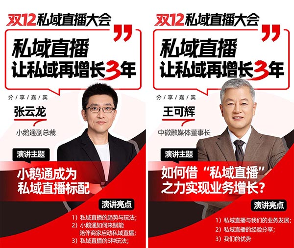 本次也邀請來了小鵝通的副總裁張云龍、中微融媒體董事長王可輝,分別分享如何做好私域直播平臺以及私域直播的5種玩法!