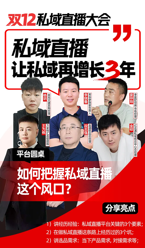 另外,我們還邀請到了幾位私域直播的頭部渠道平臺,通過圓桌會議跟大家分享:如何把握私域直播這個風口。他們將跟大家分享私域直播平臺的3個要素,以及選品的關鍵要求及需要點!