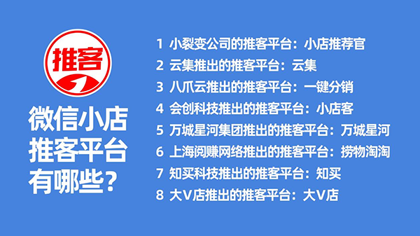 據全國推客大會主辦方沸點會匯總,目前已經看到的微信小店推客平臺有: