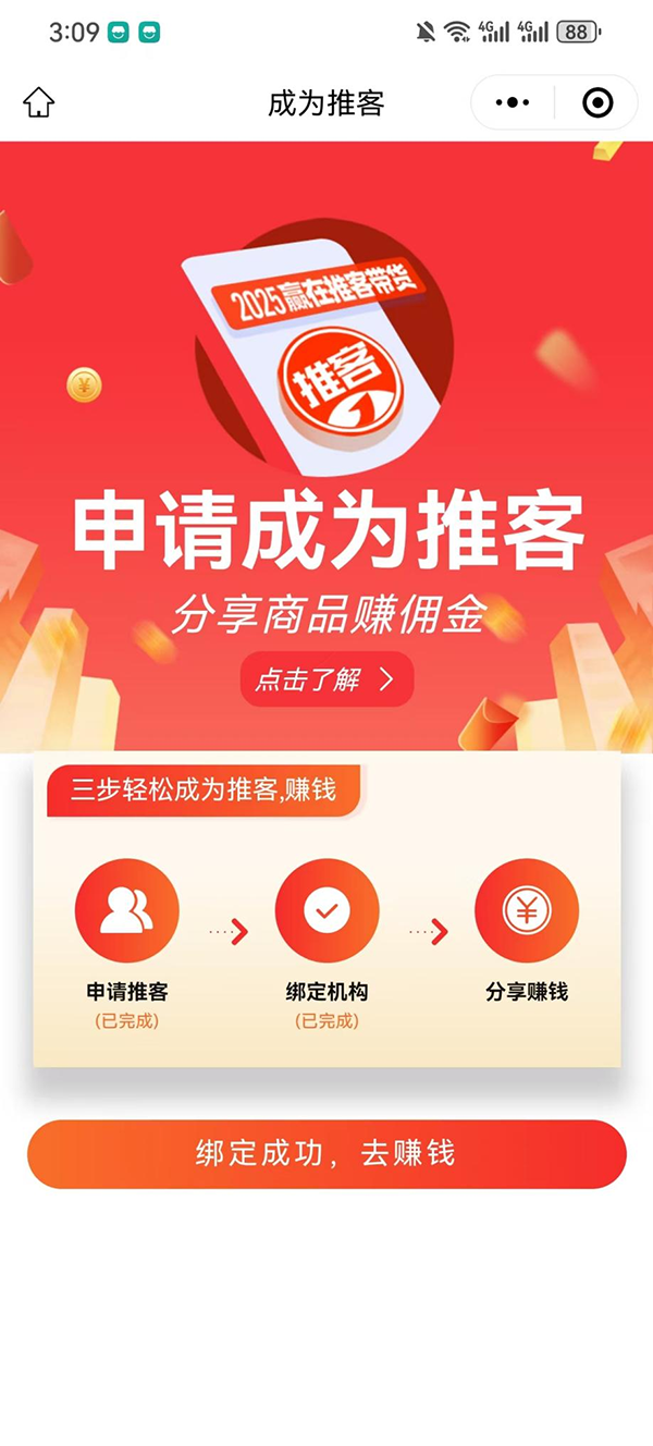 - 頁面提示“綁定成功”后,點擊“去賺錢”.跳轉至推客推廣中心。