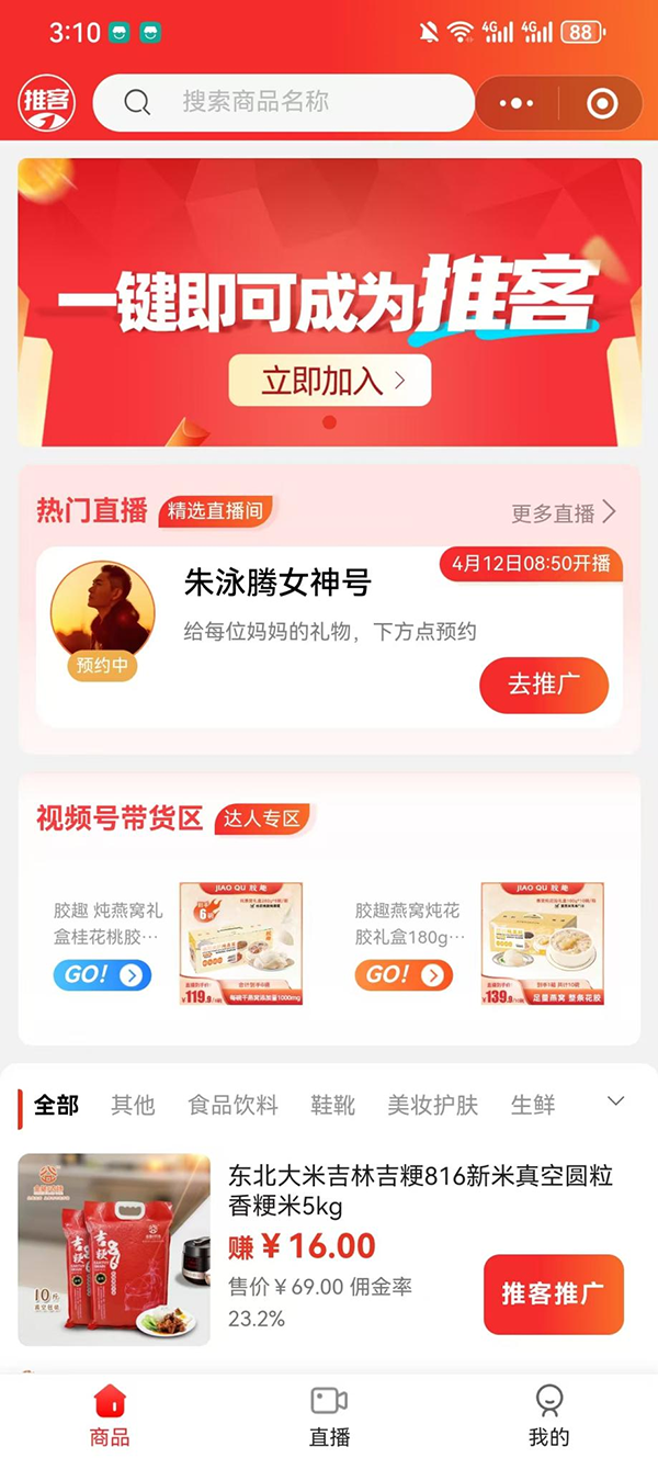 選擇適合你客戶群的商品或直播間,點擊"推客分享",進行推廣分享