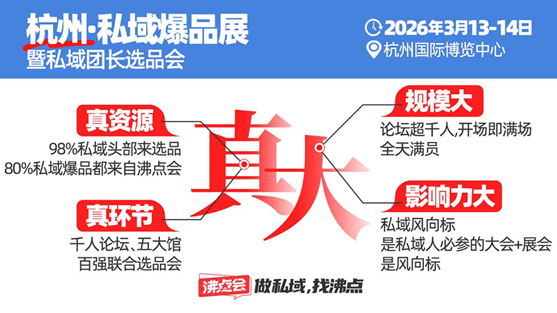 國(guó)內(nèi)私域電商領(lǐng)域規(guī)模領(lǐng)先的開年盛會(huì)——2026杭州萬(wàn)人私域爆品選品大會(huì)(簡(jiǎn)稱沸點(diǎn)會(huì))將于明年3月13日至14日在杭州國(guó)際博覽中心隆重舉行。據(jù)悉,這將是該展會(huì)舉辦的第30屆盛會(huì),預(yù)計(jì)活動(dòng)面積達(dá)5萬(wàn)平方米,匯聚超1000家參展商。