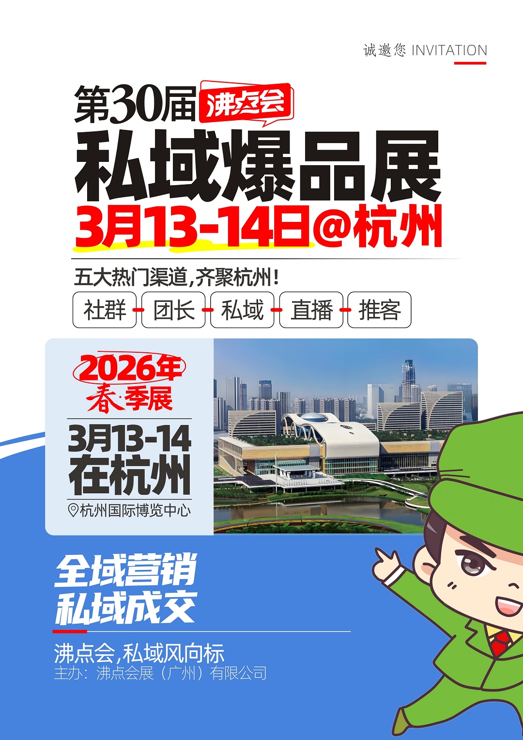 新聞導讀2026私域開年大展,第30屆沸點會暨杭州私域爆品展,官宣定檔2026年3月13-14日,將在杭州國際博覽中心舉辦。