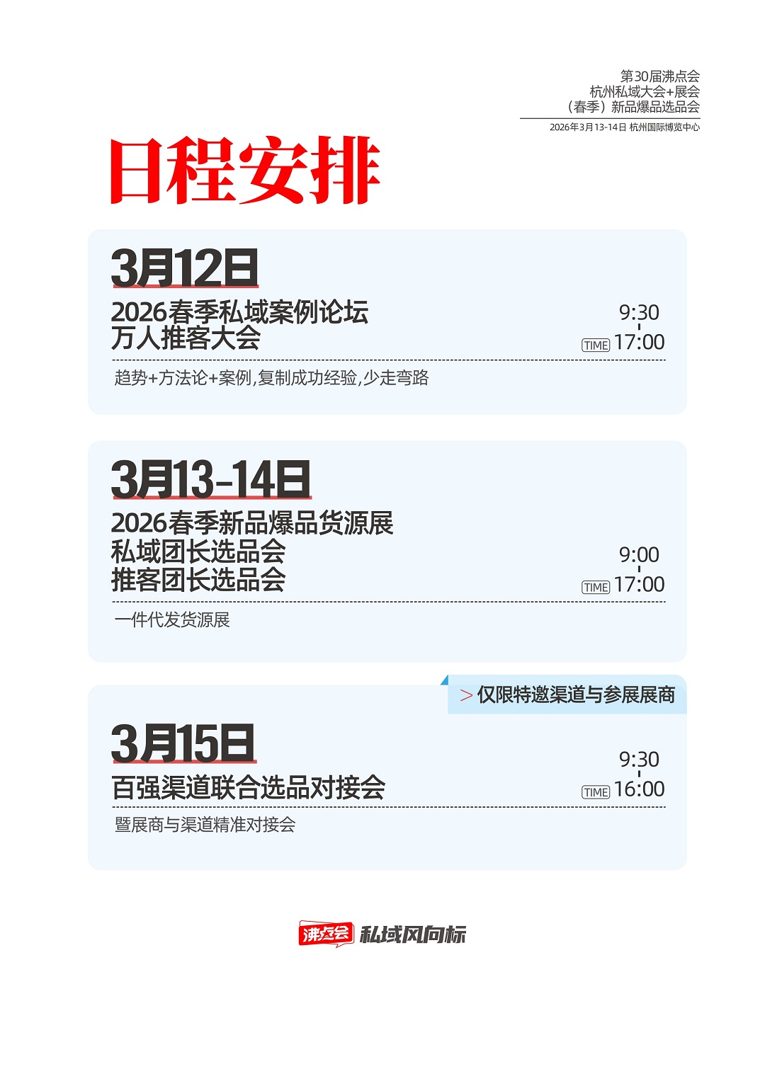 3月13-14日:2026春季新品爆品貨源展;1000+供貨商同臺展示產品,98%私域頭部渠道現場選品。
