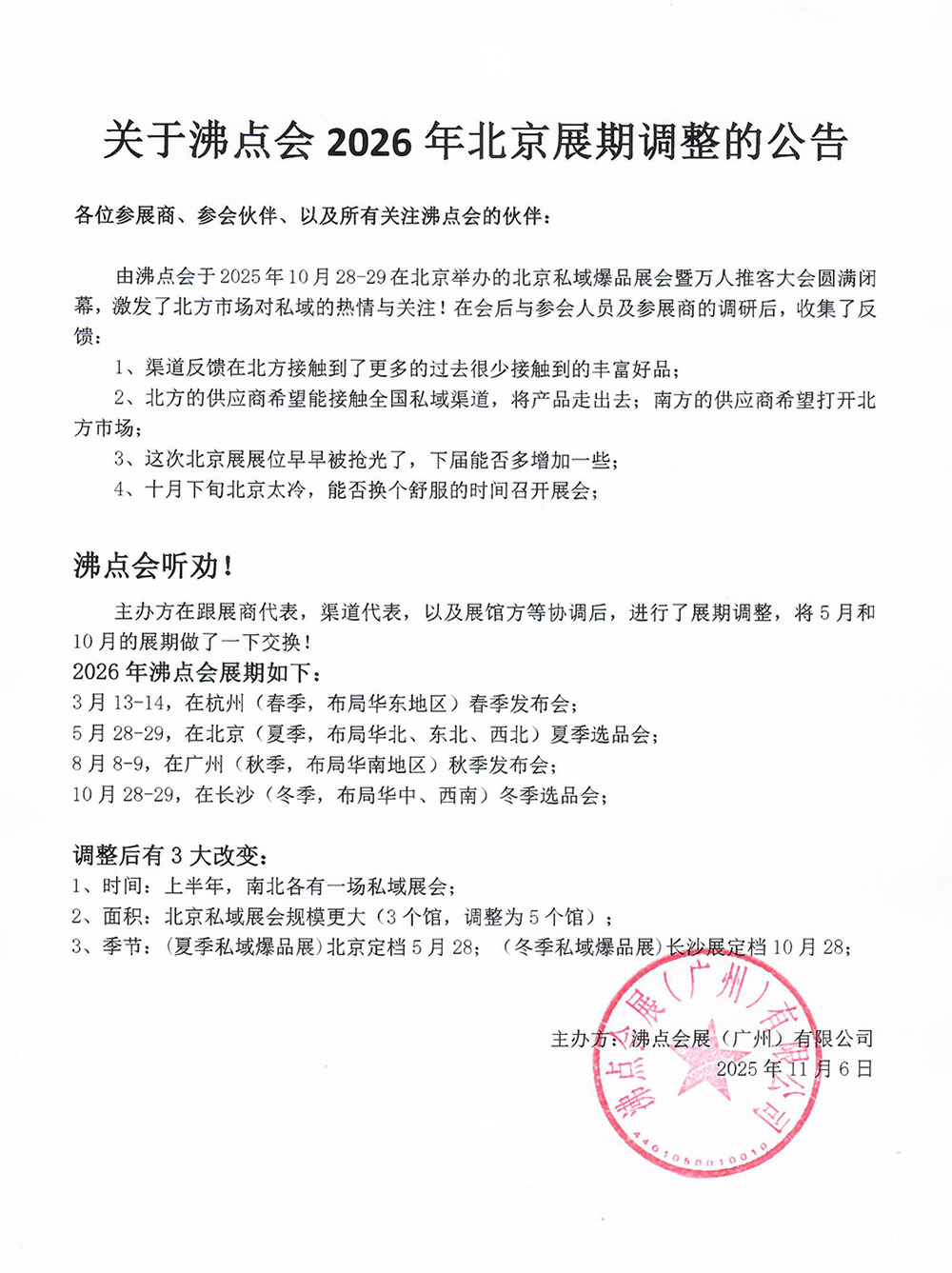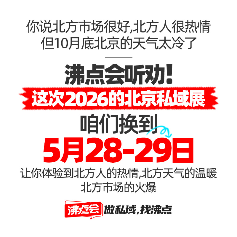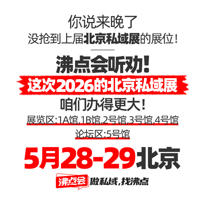 新聞導(dǎo)讀10月30-11月6,今天正好是北京私域展會結(jié)束一周的時間;這一周,我們聆聽了展商,渠道,員工,多方的聲音…也組織沸點會管理層做了多次內(nèi)部討論,又與展館方做了溝通,終于,今天跟大家正式公布:聽勸,改期!2026年北京私域展會展期!
