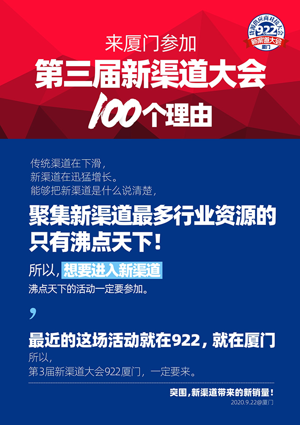 9月22號,廈門,新渠道大會,沸點天下歡迎更多創業者了解新渠道,加入新渠道,實現新增長。