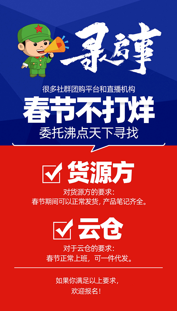 很多社群團購平臺和直播機會春節不打烊,委托沸點天下尋找貨源方;云倉。