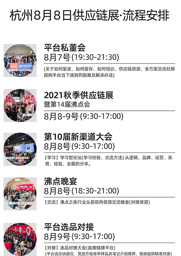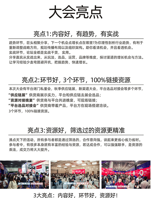 沸點會暨供應鏈展以“順勢而為,渠道增長”為主題,將聚集600+供貨商,500+平臺,500+MCN機構及個人主播,300+供應鏈前來選品洽談合作;更有20+名嘉賓與會,圍繞社群團購趨勢、爆品打造、人員裂變、活動運營、品牌塑造等多個維度進行探討交流。