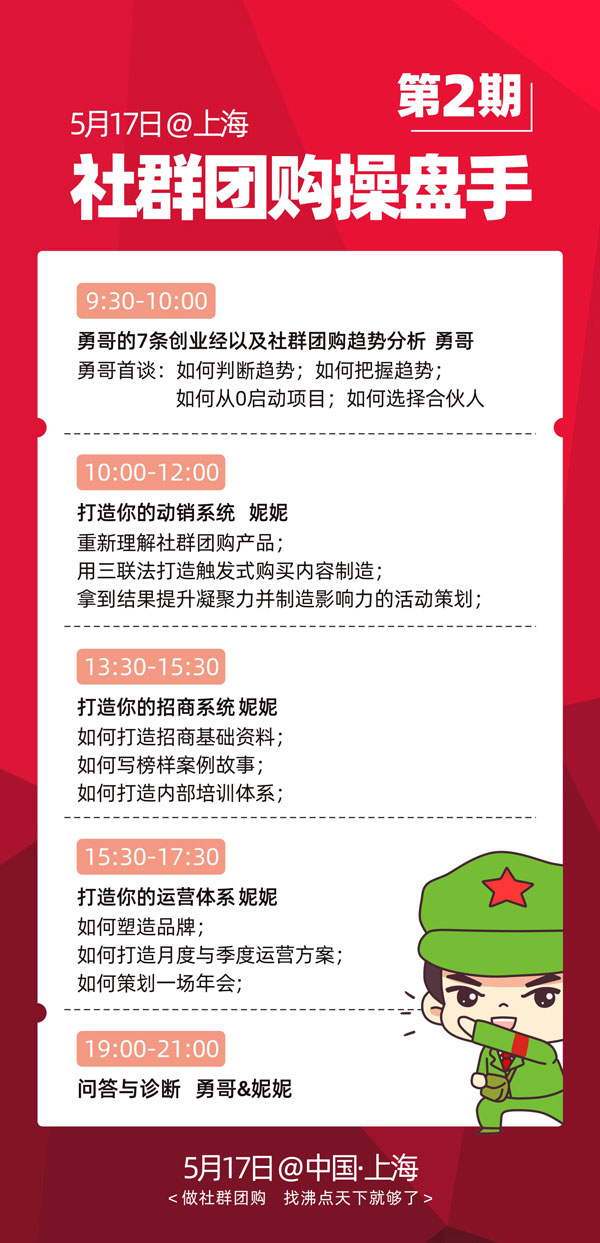 如果你想跟勇哥進行更加深入的探討,5月17號,上海,第二期社群團購操盤手,可以跟勇哥討論關于創業 ,關于社群團購行業,以及關于如何把項目做得影響力更大,人員增長更快。