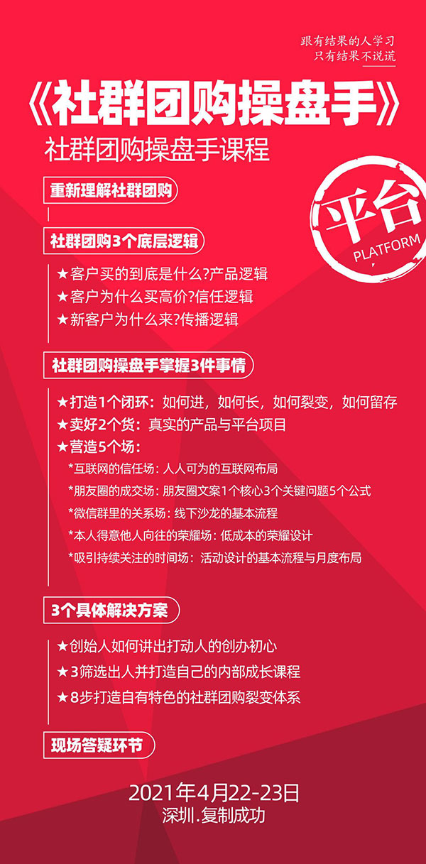 想要詳細梳理社群團購平臺底層邏輯,歡迎參加4.22-23號,沸點天下執行總裁妮妮主講的《社群團購操盤手》課程!
