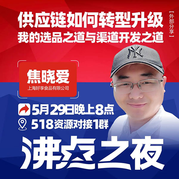 2021年5月29日晚上8點,本期沸點之夜的分享嘉賓是好享食品創始人焦曉愛,他以“供應鏈轉型升級,我的選品之道與渠道開發之道”這一主題內容,為大家帶來了精彩的分享。