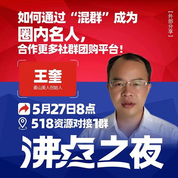 2021年5月27日晚上8點,沸點之夜分享嘉賓姜山美人創始人王奎,他以“如何通過混群,成為圈內名人,合作更多社群團購平臺!”這一主題內容,為大家帶來了精彩的分享。