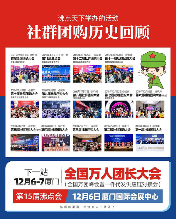 12月6號,全國萬人團(tuán)長大會暨全國萬團(tuán)峰會,行業(yè)頭部聚集,選好產(chǎn)品,向圈內(nèi)高手取經(jīng),參加行業(yè)的年度頒獎盛典,聽取2022年團(tuán)購趨勢分析,凡是想在2022年在團(tuán)購賽道取得不錯結(jié)果的團(tuán)長和平臺,都應(yīng)該來。