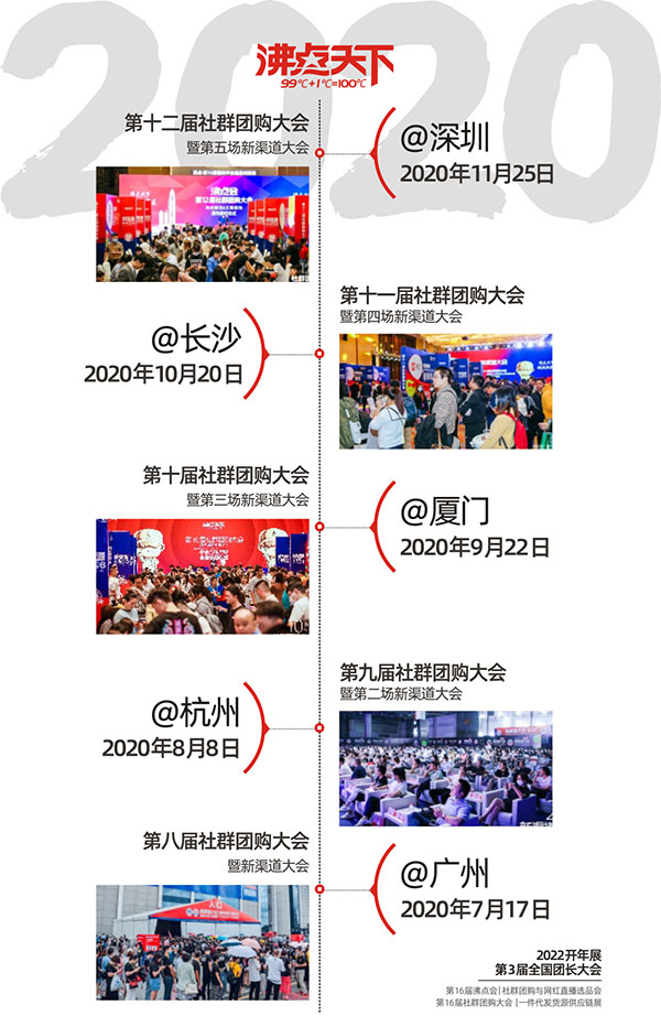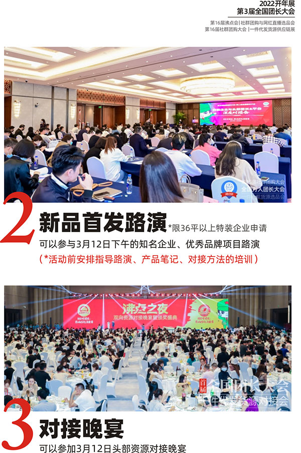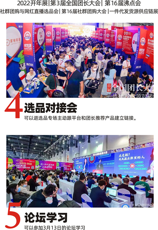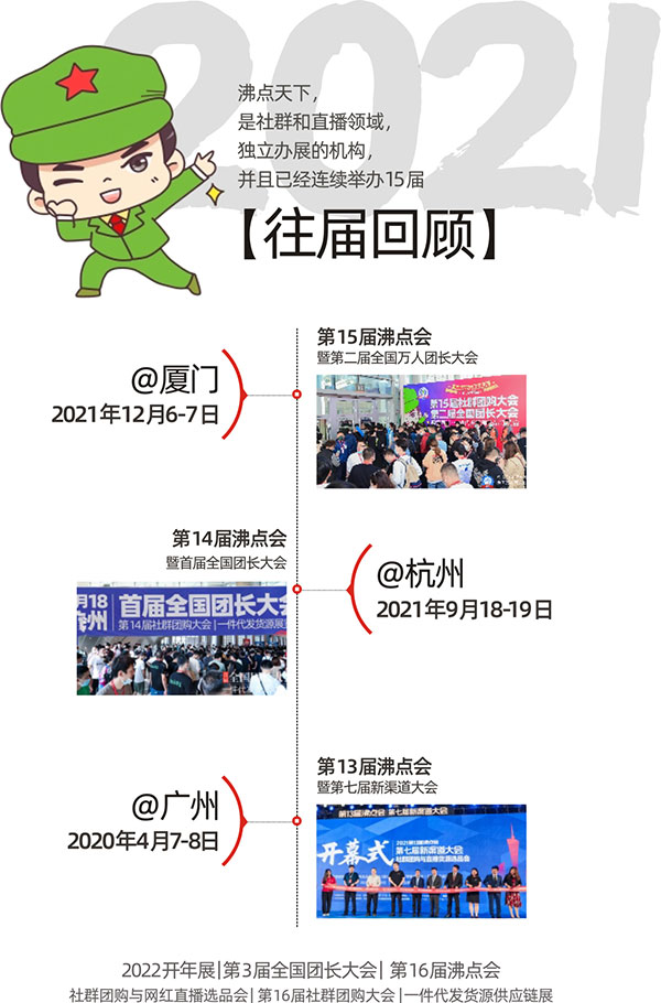 第16屆沸點會暨第3屆全國萬人團長大會,3月13-14號在杭州舉辦,這是2022年的開年展,團購渠道和直播渠道都會來這場活動現場來選品,如果你是供貨商,想要拓展渠道,這場活動你一定要參加。雙渠道,增長加倍。