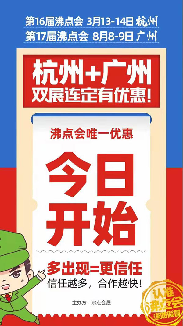 沸點會的展位一直是統一價格銷售,這次也是針對兩展連定的客戶,推出了限時的優惠政策,這個政策只是到1月15號為止,歡迎新老朋友抓緊時間預定!!