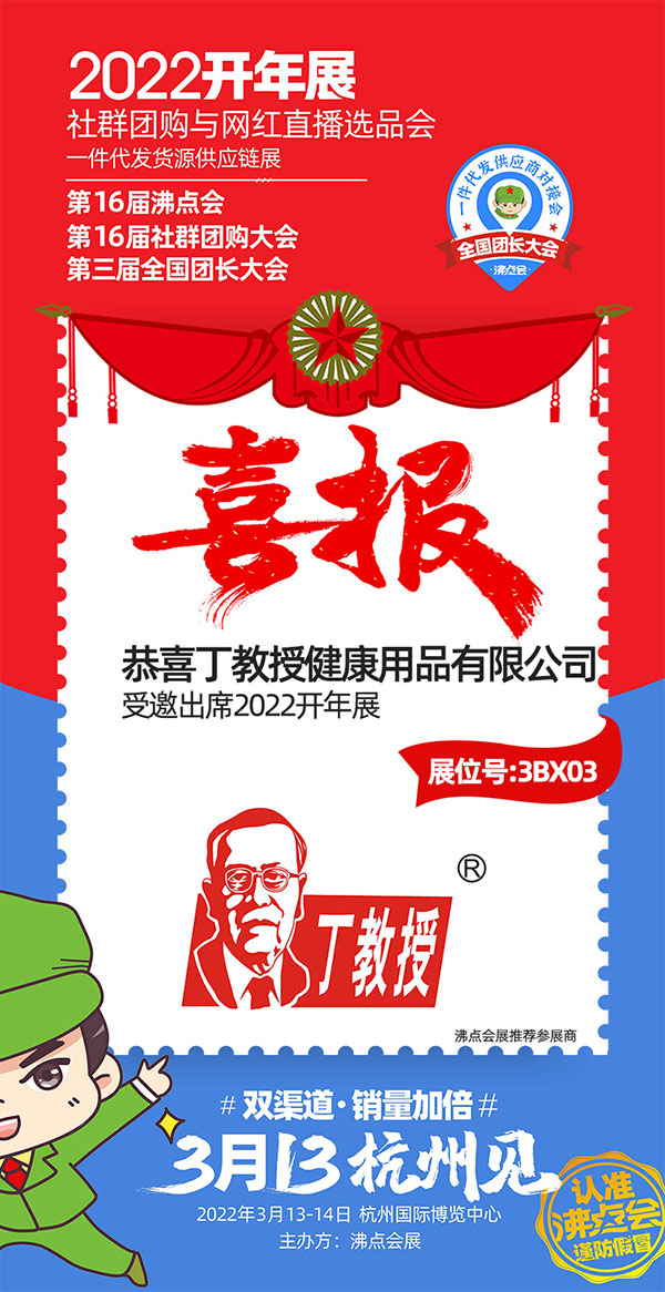 2022開年展暨第16屆社群團購大會,吸引全國各個領域優秀的供應商資源,是一項以行業交流,促進品牌合作為目的的大型活動。3月13-14日,丁教授大健康產業集團與您相約杭州國際博覽中心!鎖定展位號:3BX03,期待你的到來!