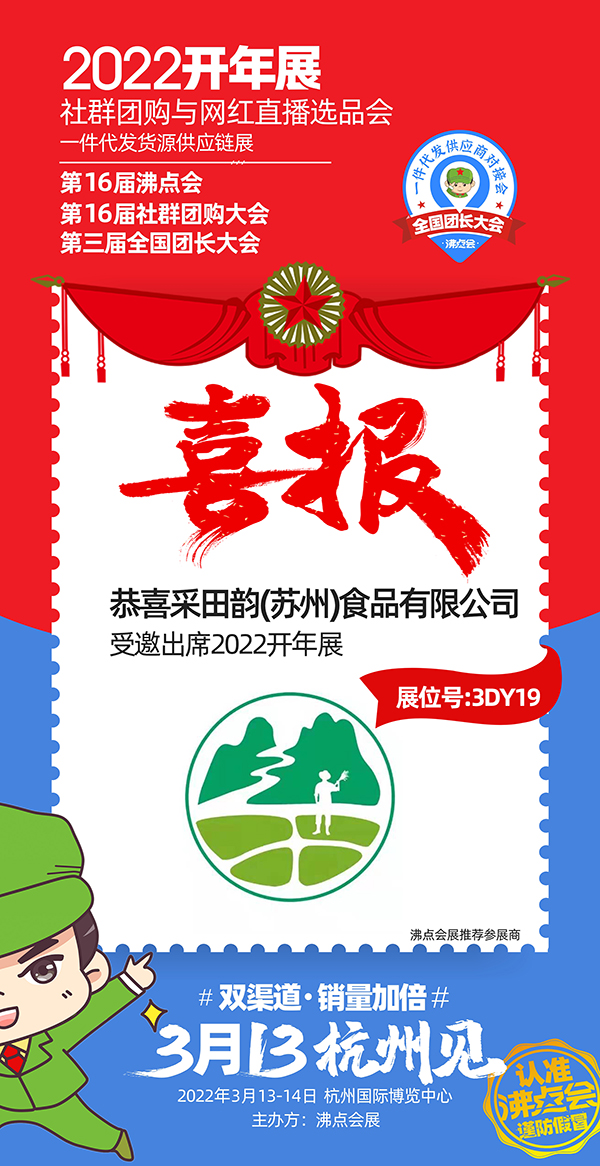 2022杭州團長大會,3月13-14號在杭州舉辦,這是2022年的開年展,團購渠道和直播渠道都會來這場活動現場來選品,雙渠道,增長加倍。屆時,采田韻(蘇州)食品有限公司受邀參展!