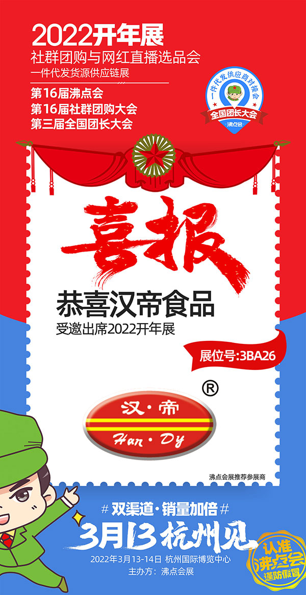 3月13—14日,2022杭州團長大會,漢帝食品將在此璀璨亮相,展位號:3BA26,屆時恭候您光臨選品!
