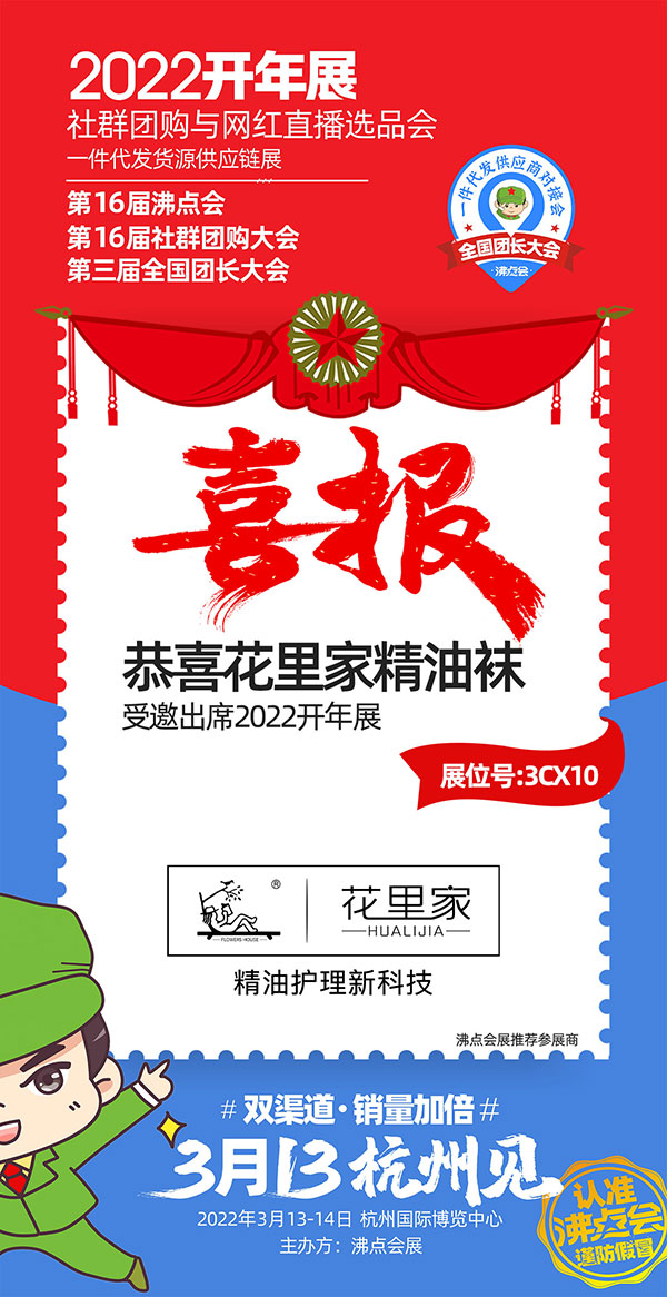 2022年3月13-14日,在杭州國際博覽中心隆重舉辦的2022杭州團長大會分為3大館,6大展區(qū),目前正在進行展位招募,參展商和平臺方都在踴躍報名中,如此盛典,杭州藝群科技有限公司旗下產(chǎn)品“花里家精油襪”受邀參展本次展會。