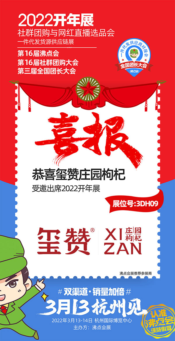 由沸點天下創辦、沸點會展主辦的2022杭州團長大會定于2022年3月13-14日舉辦,大會分為3大館,6大展區。目前正在進行展位招募,璽贊莊園枸杞有限公司將受邀參展此次活動!