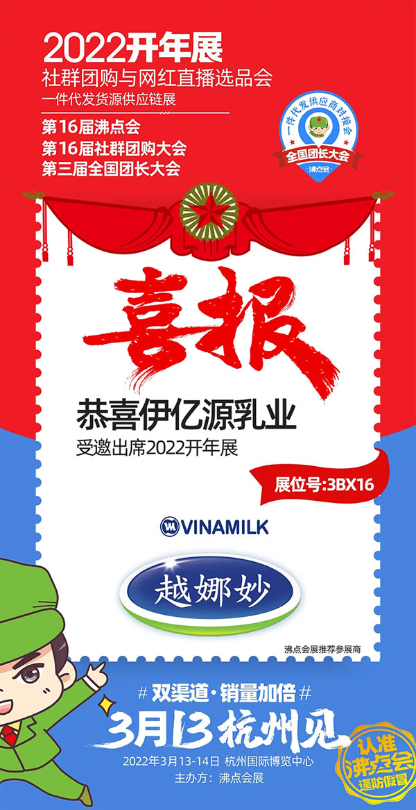2022年3月13-14日,2022開年展在杭州國際博覽中心隆重舉辦,聚焦雙渠道、銷量增長加倍。大會分為3大館,6大展區(qū):美妝護膚展區(qū)、百貨家居小家電展區(qū)、服裝飾品箱包鞋帽展區(qū)、母嬰童裝玩具展區(qū)、食品零食展區(qū)、農特生鮮展區(qū)。如此盛典,Vinamilk&越娜妙品牌中國區(qū)代理商——長沙伊億源乳業(yè)有限公司受邀參展此次活動。