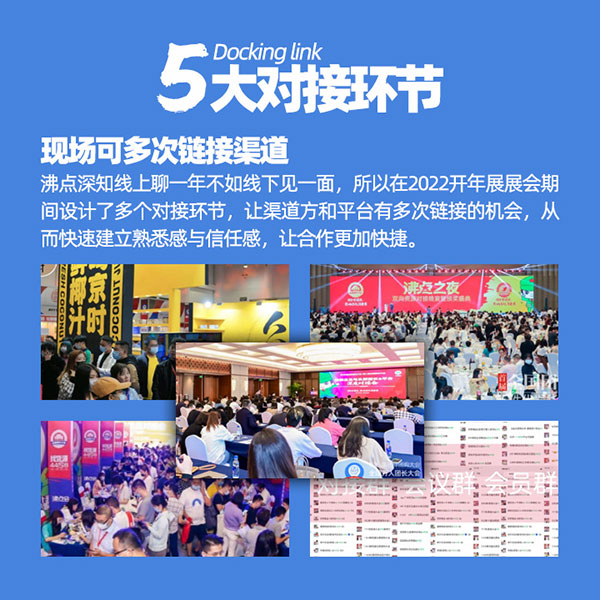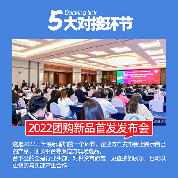 團(tuán)長(zhǎng)大會(huì)有5大環(huán)節(jié):2022團(tuán)購(gòu)新品首發(fā)發(fā)布會(huì),第3屆全國(guó)團(tuán)長(zhǎng)大會(huì),沸點(diǎn)之夜資源對(duì)接晚宴,新渠道大會(huì),以及渠道選品對(duì)接會(huì)。