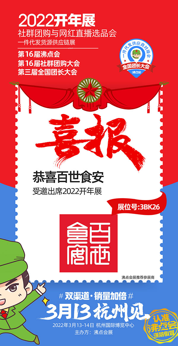 由沸點會展主辦的2022杭州全國團長大會,一件代發貨源對接會即將于3月13-14日在杭州國際博覽中心舉辦,屆時,涵蓋了美食、美妝、母嬰、零食、服裝、百貨、小家電、特產生鮮等各類適合社群團購和直播電商的一件代發一手貨源將競相亮相,北京百世食安健康科技有限公司也將驚艷亮相本次展會。