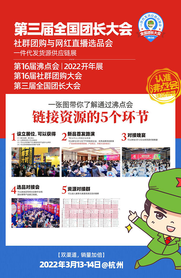全國團長大會是由沸點會展創(chuàng)辦,旨在助力供貨商拓展團長渠道實現(xiàn)銷售增長。到目前為止,全國團長大會已經(jīng)成功了舉辦了2屆,行業(yè)頭部的團長,頭部社群團購平臺都來活動現(xiàn)場來選品,鏈接資源。第3屆全國團長大會將于3月13-14號在杭州國際博覽中舉辦。