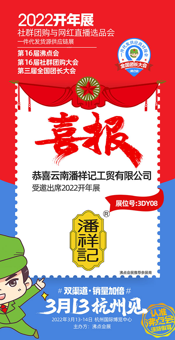 于2022年3月13-14號在杭州國際博覽中心舉辦的2022杭州團長大會暨第16屆社群團購大會,活動展位面積30000平米,展商數量800+,新品爆品10000+,渠道方1000+,行業觀眾10000+,目前正在進行展位招募,云南潘祥記工貿有限公司強勢入駐本次展會。