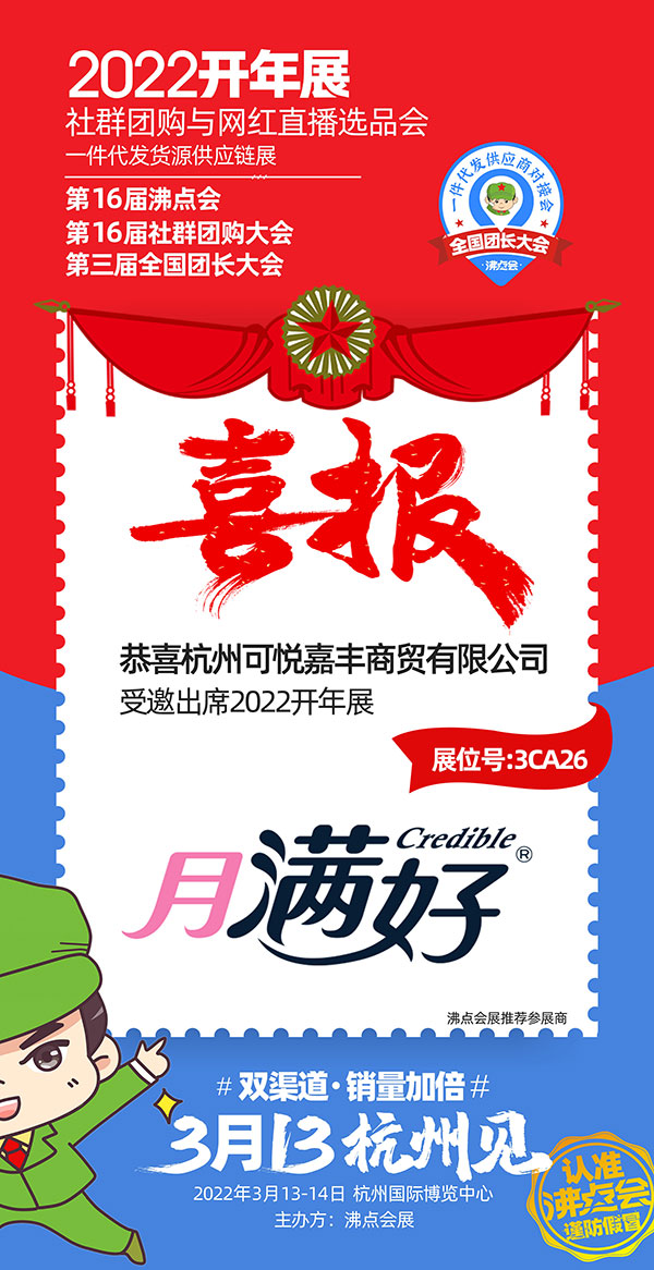 由社群電商引領者沸點天下創立、沸點會展主辦的2022杭州全國團長大會,一件代發貨源對接會將于2022年3月13-14日,在杭州國際博覽中心舉辦!目前正在進行展位招募,參展商和平臺方都在踴躍報名中,個人衛生護理領域的民營獨資企業——杭州可悅嘉豐商貿有限公司受邀參展本次展會。
