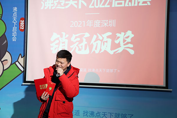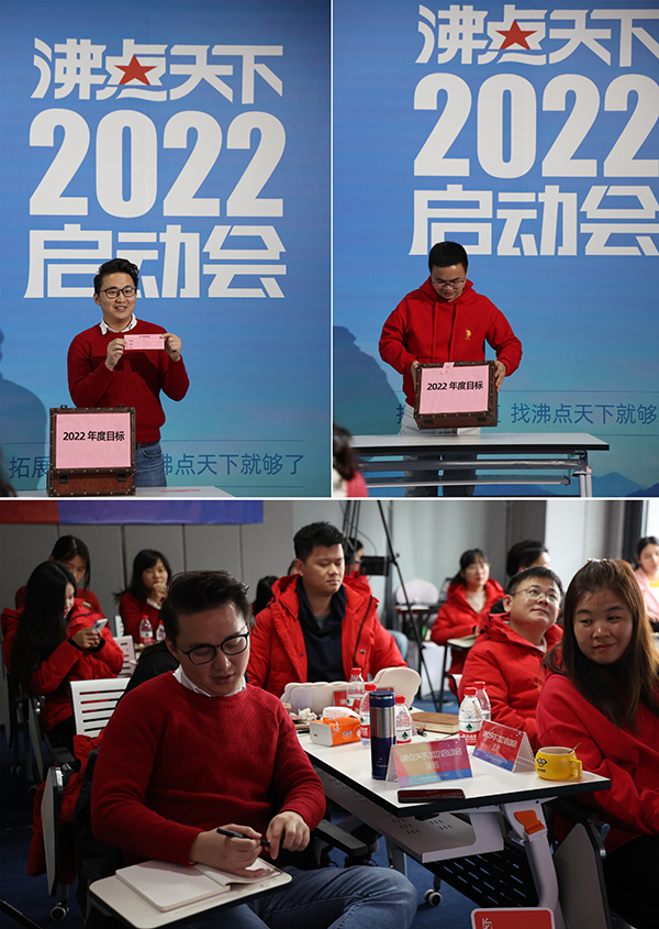 2022年2月9號,沸點天下2022啟動會,在深圳隆重舉辦,公司領導層就公司規劃,行業趨勢,部門規劃等做了發布;邀請了2021年度優秀同事做了經驗分享;會上還舉辦了2021年度深圳銷售冠軍以及2021年深圳新人王的頒獎儀式;接著舉辦了儀式感滿滿的2022年個人目標封箱儀式。