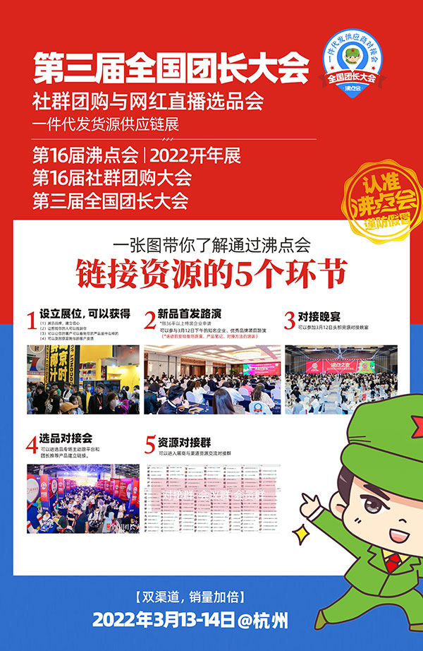 2022開年展是沸點天會展舉辦的,一場以新渠道資源鏈接合作為主的展會,主題是:雙渠道,增長加倍。其中,雙渠道指的是團購和直播兩大渠道。意味著會有更多的渠道會來現場選品,也是生產企業,品牌方,供應鏈拓展渠道的好機會。