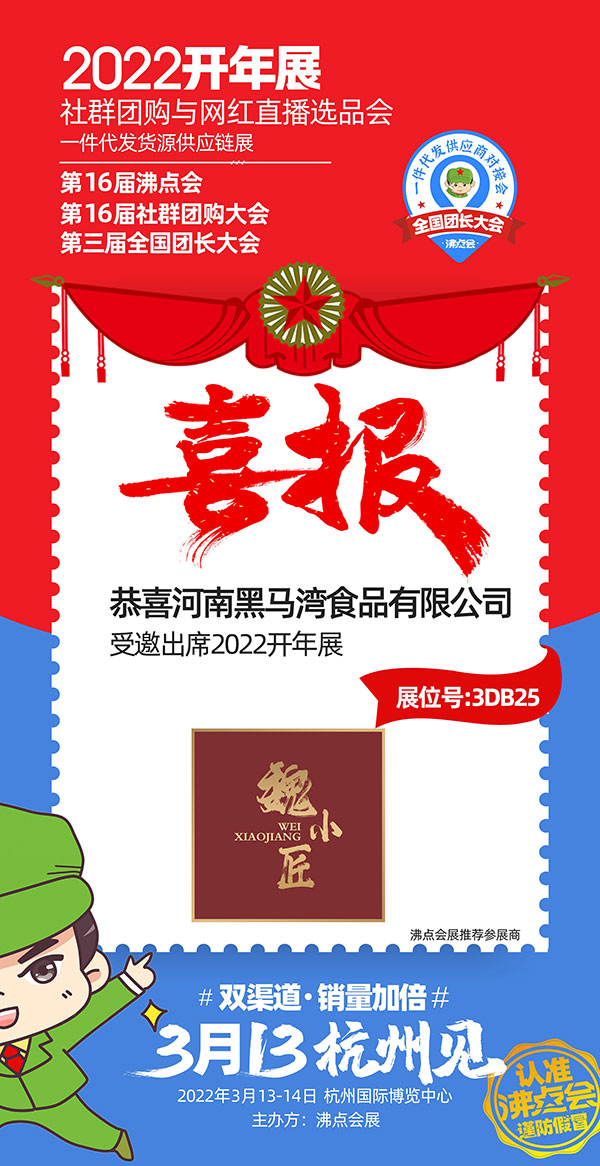 2022杭州團長大會定于2022年3月13-14號在杭州國際博覽中心舉辦,目前正在進行展位招募,參展商和平臺方都在踴躍報名中,河南黑馬灣食品有限公司也將受邀參展本次展會。
