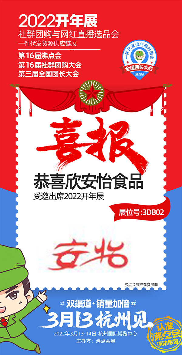 由沸點會展主辦的2022開年展暨第16屆沸點會(杭州)供應鏈展、社群團購與直播選品會、第三屆全國團長大會&一件代發貨源對接會系列活動將于3月13-14日在杭州國際博覽中心隆重舉辦,聚焦雙渠道、銷量增長加倍。屆時,重慶欣安怡食品有限責任公司受邀參展。