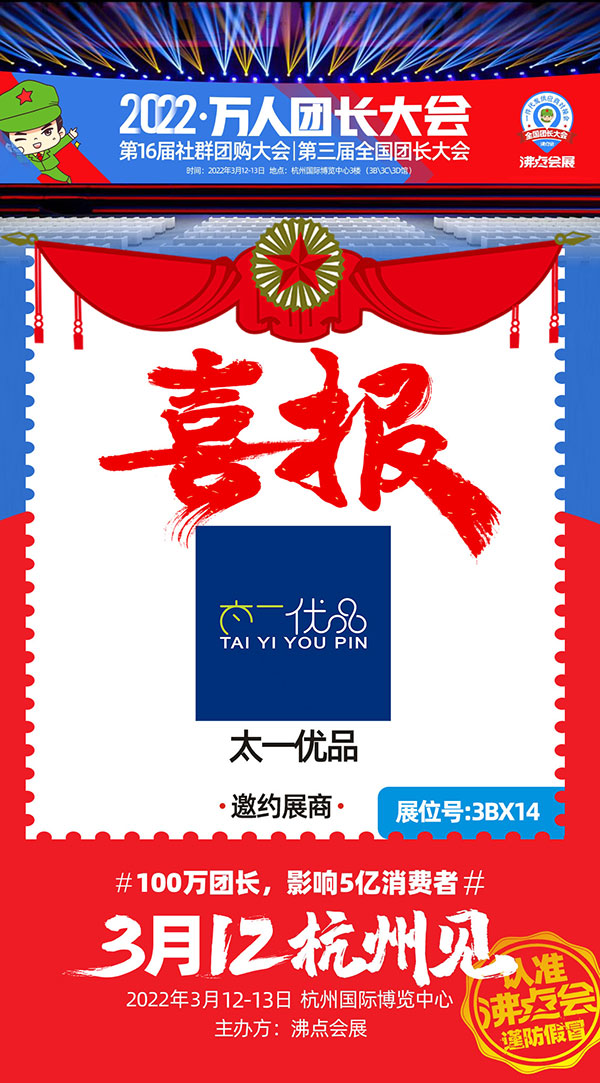 2022杭州全國團長大會,一件代發貨源對接會即將于3月12-13日在杭州國際博覽中心舉辦,屆時,涵蓋了美食、美妝、母嬰、零食、服裝、百貨、小家電、特產生鮮等各類適合社群團購和直播電商的一件代發一手貨源將競相亮相,汕頭市太一優品供應鏈管理有限公司亮相本次展會。