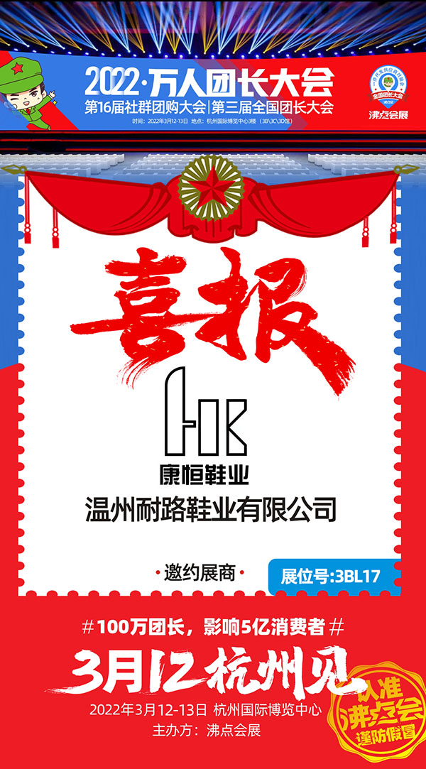 2022杭州團(tuán)長(zhǎng)大會(huì)吸引了眾多王牌企業(yè)參展,溫州市康恒鞋業(yè)想通過此次活動(dòng)對(duì)接更多線上銷售渠道,各大主播對(duì)接選品和社群團(tuán)購(gòu)及線下供貨,支持抖音精選聯(lián)盟和快手好物聯(lián)盟以及淘寶淘客聯(lián)盟線上自動(dòng)分傭。3月12—13日,溫州市康恒鞋業(yè)與您相約杭州國(guó)際博覽中心3BL17展位,期待和大家一起變得更好!
