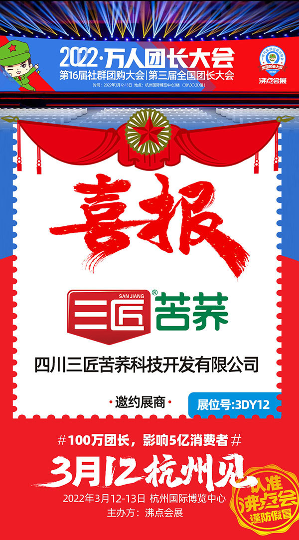 為期二天的2022杭州團長大會暨第16屆社群團購大會定于2022年3月12-13號在杭州國際博覽中心舉辦,作為2022年的行業盛宴,吸引了美食、美妝、母嬰、零食、服裝、百貨、小家電、特產生鮮等各類適合社群團購和直播電商的一件代發一手貨源前來參展,如此盛典,四川三匠苦蕎科技開發有限公司受邀參展!