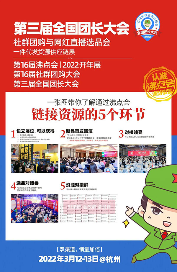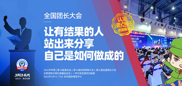 3月12-13日,在杭州國際博覽中心,第3屆全國團(tuán)長大會(huì)暨2022春季一件代發(fā)貨源展,第16屆沸點(diǎn)會(huì)即將舉辦。
